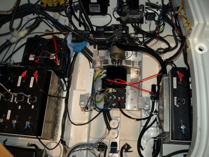 Alle Komponenten sind eingebaut und angeschlossen. Oberhalb der Fahrbatterien befinden sich die Servicebatterien., das Ladegerät hierzu links über dem Motor Das Hydraulikaggregat für den Sterndrive befindet sich oberhalb des Getriebes.